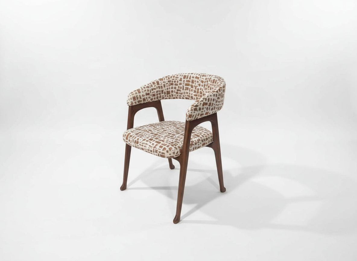 De stoel is vervaardigd met een massief frame van zwart walnotenhout en heeft een sculpturaal, organisch silhouet: een doorlopende gebogen rugleuning en geïntegreerde armleuningen creëren een omhullend, ergonomisch ontwerp, aangevuld door slanke, taps toelopende poten die de stabiliteit en visuele lichtheid versterken. De zorgvuldige verbindingen en de rijke houtnerf benadrukken de hoogwaardige kwaliteit, terwijl de geometrische bekleding een modern artistiek contrast vormt met de natuurlijke houttinten.